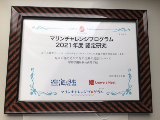 本校科学部の安田さんが中心で行っている研究「海水が混じる川の泥の沈殿の反応について」が、一般社団法人日本先端科学技術教育人材研究機構、日本財団、株式会社リバネスが主催の「マリンチャレンジプログラム 2021年度」に採択されました。マリンチャレンジプログラム内での研究を深める取り組みの後、8月15日に発表会がZoomで行われました。最終選考には惜しくも残ることが出来ませんでしたが、この後も研究を続けていくそうです。