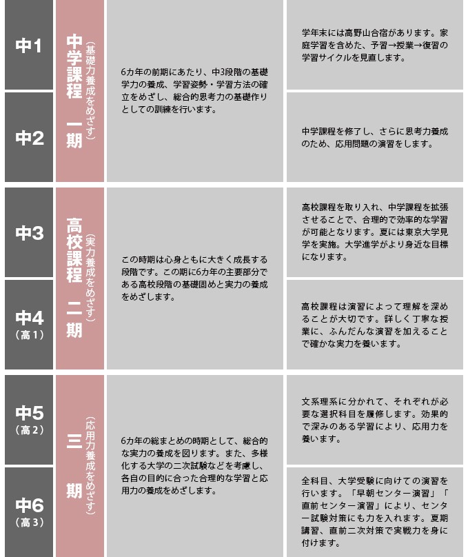 中学内容は中2までで終了。中3からは高校内容を取り入れ、高2までで高校内容を終了。高3では、大学入試問題の演習に全力で取り組みます。切磋琢磨しあえる素晴らしい仲間と共に頑張りましょう。